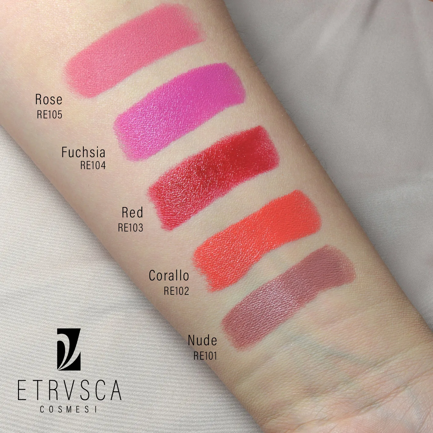 RE101 – RE104 – OLIO DI SEMI DI RICINUS COMMUNIS, OTTILDODECANOLO, SILICE, ETERE DI DICAPRIL, CERA SINTETICA, BIS-DIGLICERILE POLIACILADIPATO-2, CAOLINO, CARBONATO DI CALCIO, CERA MICROCRISTALLINA, CERA MICROCRISTALLINA IDROGENATA, IALURONATO DI SODIO, OLIO DI SEMI DI SIMMONDSIA CHINENSIS, ACETATO DI TOCOFERILE, OLIO DI FRUTTO DI OLEA EUROPAEA, GLUCOMANNANO, TETRAISOSTEARATO DI POLIGLICERILE-2, IDROSSIDO DI ALLUMINIO, HECTORITE DI DISTEARDIMONIUM, PALMITATO DI ETILE, PENTAERITRITIL TETRA-DI-T-BUTILE IDROSSIDROCINNAMATO, CARBONATO DI PROPILENE, ACIDO STEARICO, CERA D’API SINTETICA, TRIIDROSSISTEARINA.